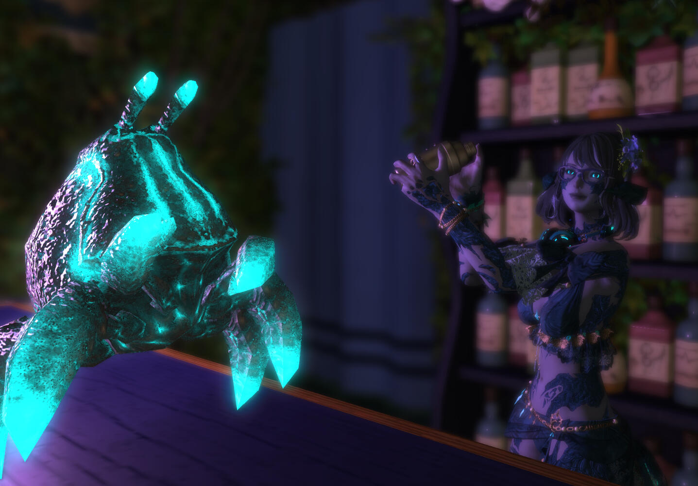 Chef Snips has been Berude’s closest friend and confidant since she arrived here in Eorzea. She trusts him with everything - especially the cooking of the food at the venue. You might think a crab lacks the manual dexterity to mix drinks or carefully prepare buuz - but you would be wrong about the buuz! He can’t mix drinks for safety reasons.